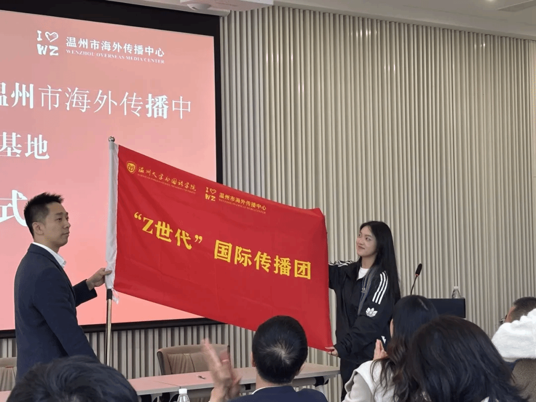 随后,举行了庄重的签约仪式,双方就平台共建、资源共享、价值共创、发展共赢等系列合作事宜签订协议,楼了凡主任和杨丽君书记为温州市海外传播基地颁授大学生校外实践基地牌子,学院还聘请许鹏怀主任担任研究生校外导师和大学生创新创业导师。作为影响社会发展的新生力量,近年来“Z世代”青年在对外交流中逐渐成为主力军,为进一步凝聚国际传播“Z世代”力量,星空平台外国语学院与温州市海外传播基地联合建立“Z世代”国际传播团,来自温大外国语学院英语、翻译、日语专业的25名学生成为团队首批成员。市委宣传部史宇翔处长为传播团授旗,“Z世代”国际传播团队长、温大外国语学院23级翻译专业陈靖谕同学在接旗后表示,“团队将不负重望,积极承担起传播温州文化、中国文化的使命,在新时代语境下创新传播方式,讲好温州故事、讲好中国故事。”