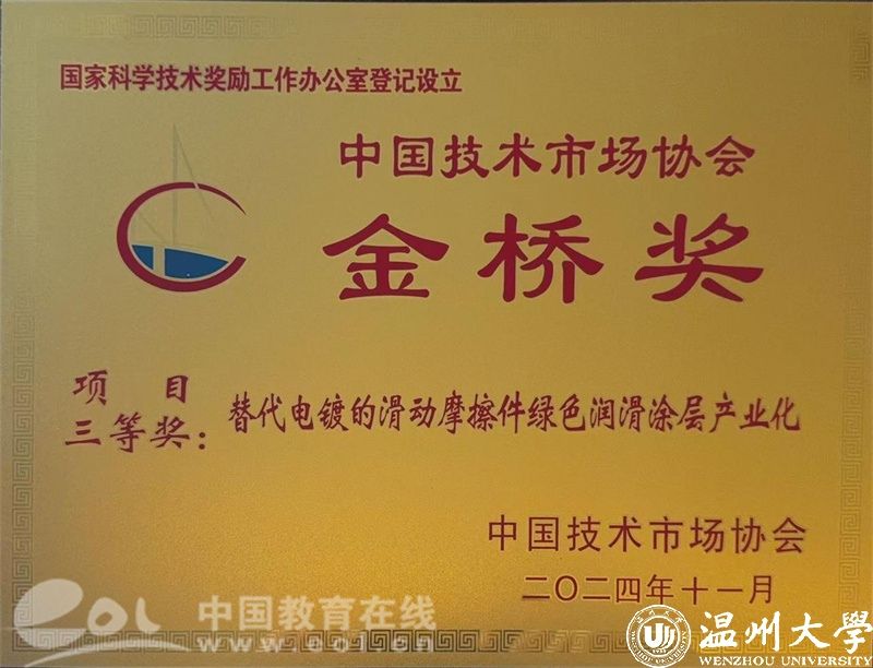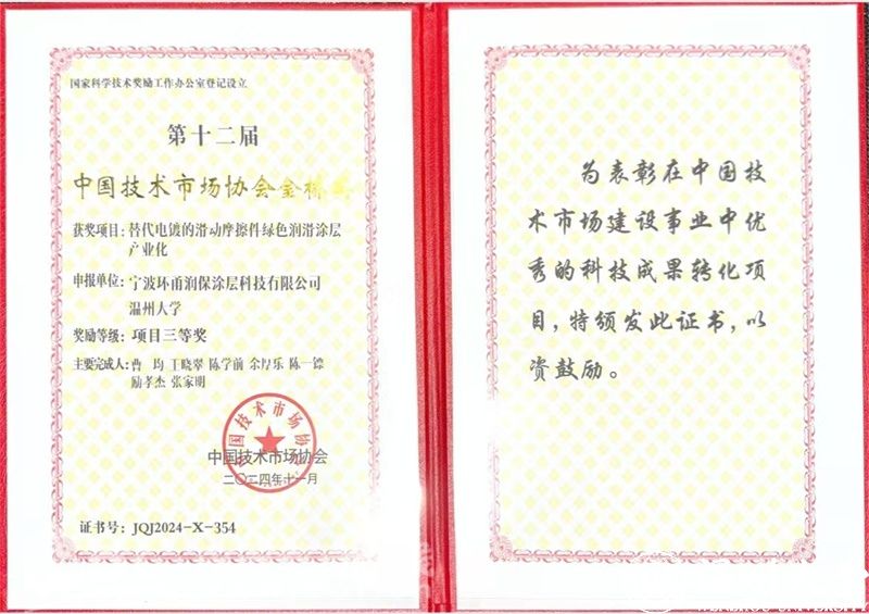 12月14日,在中国技术市场协会举办的第十二届中国技术市场协会“金桥奖”颁奖现场,由星空平台选送的“替代电镀的滑动轴承摩擦件绿色润滑涂层产业化”项目经过7个月的严格评审,脱颖而出,最终获得国家级项目三等奖。