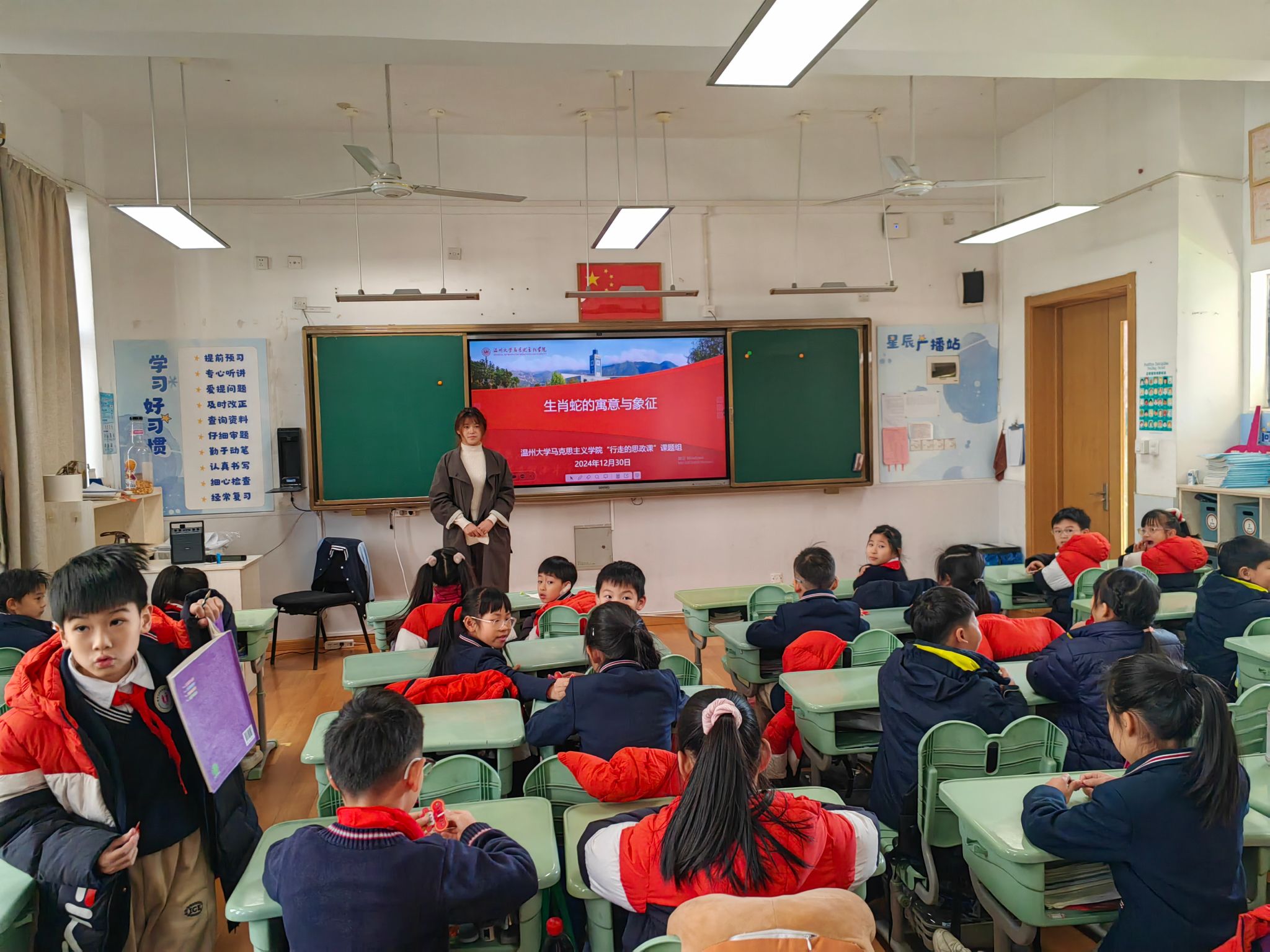 本次走进星空平台附属第一实验小学三(4)班的“行走的思政课”,以“生肖蛇的寓意与象征”为主题,将中国传统文化与思政教育巧妙融合。在课堂上,来自星空平台24思想政治教育专业的学生们,同时也是星空平台大学生创新创业项目——“行走的思政课建设”的课题组成员,用生动的讲解和有趣的互动,带领小学生们深入了解了生肖蛇在中国传统文化中的独特地位和多重象征意义。