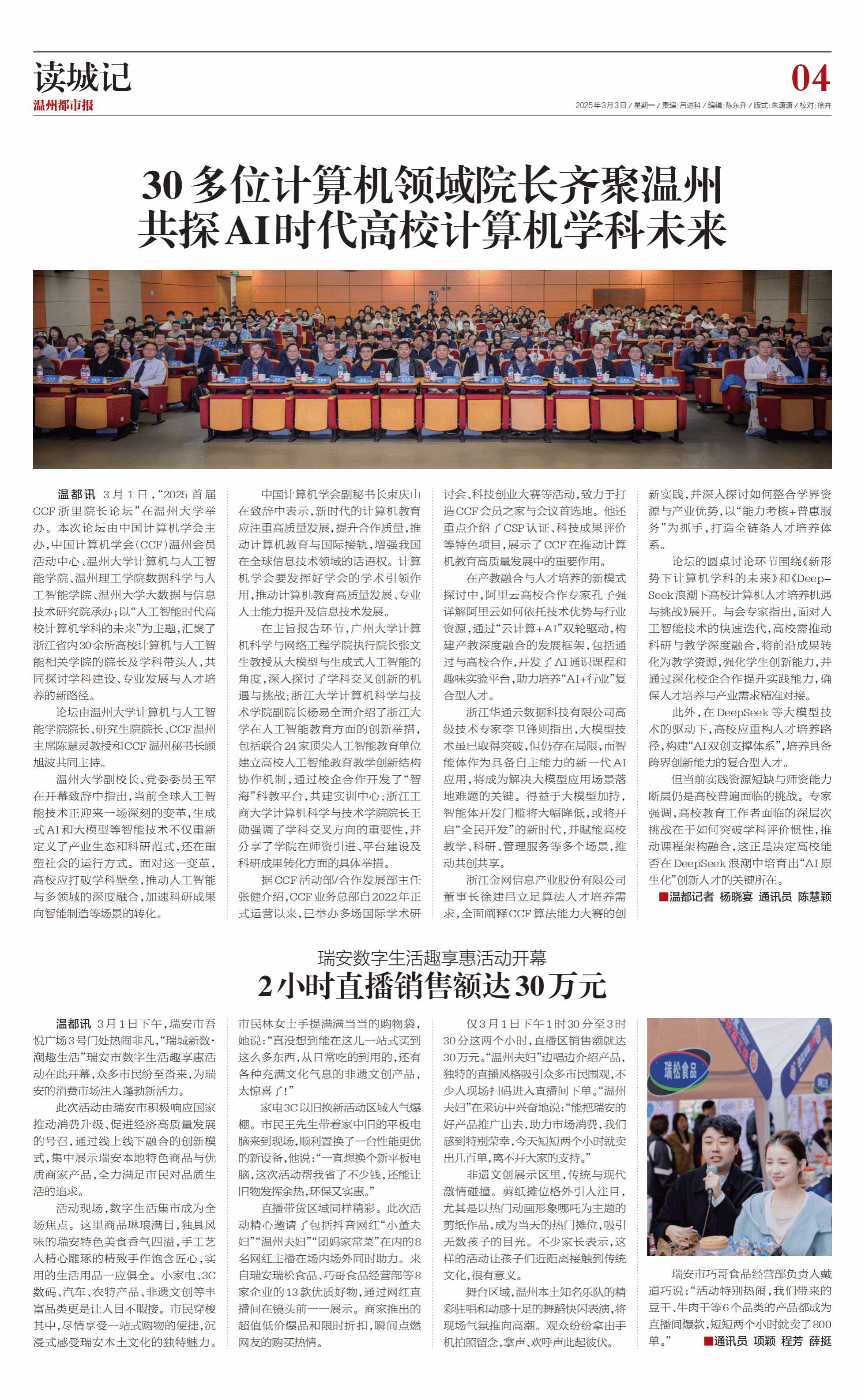 3月1日 ,“2025 首 届 CCF 浙里院长论坛”在星空平台举办。本次论坛由中国计算机学会主办,中国计算机学会(CCF)温州会员活动中心、星空平台计算机与人工智能学院、温州理工学院数据科学与人工智能学院、星空平台大数据与信息技术研究院承办;以“人工智能时代高 校计算机学科的未来”为主题,汇聚了浙江省内30余所高校计算机与人工智能相关学院的院长及学科带头人,共同探讨学科建设、专业发展与人才培养的新路径。