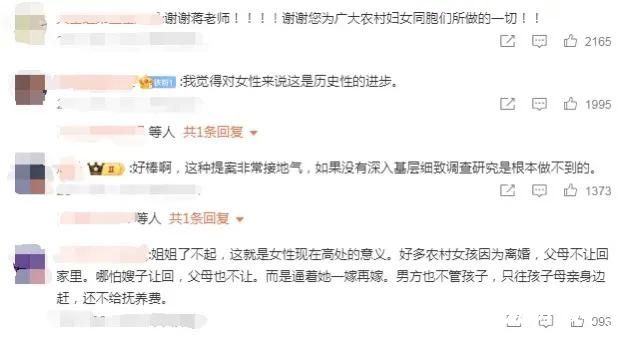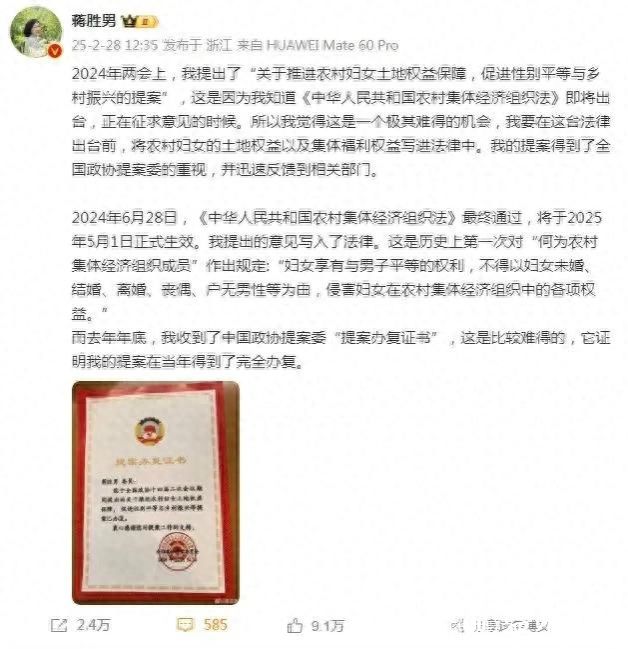 提到蒋胜男的提案,大家一定会想起她关于农村妇女土地权益的提案,这一举动简直是惊世骇俗!她不满足于仅仅做一名作家,更深入到社会问题中去,推动《中华人民共和国农村集体经济组织法》的修改,保障农村女性的土地权益。