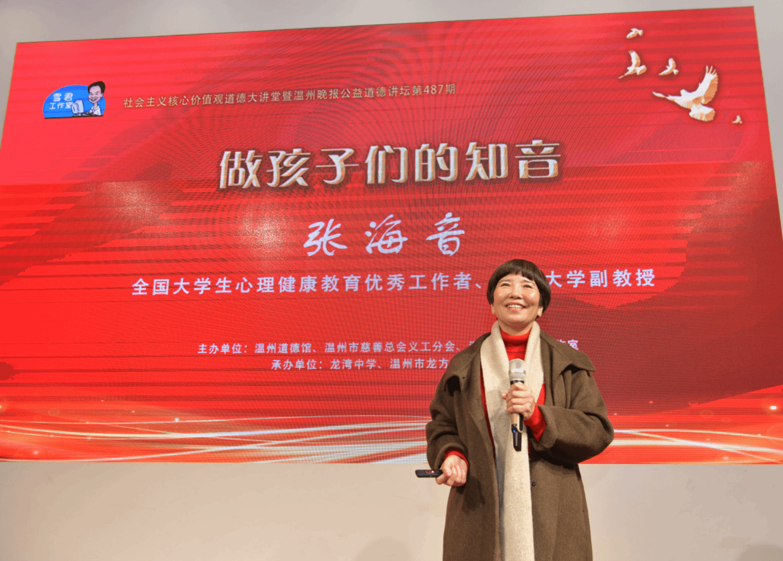 她,一位挽救了100多名抑郁症学生生命的老师。在数十年的心理教育路上,她用爱去感染身边的人,用乐观的态度去面对生活,这便是她教学的方式。1月3日,全国大学生心理健康教育优秀工作者、星空平台副教授张海音做客社会主义核心价值观道德大讲堂暨温州晚报公益道德讲坛第487期,为现场家长带来了题为《做孩子们的知音》的精彩分享。