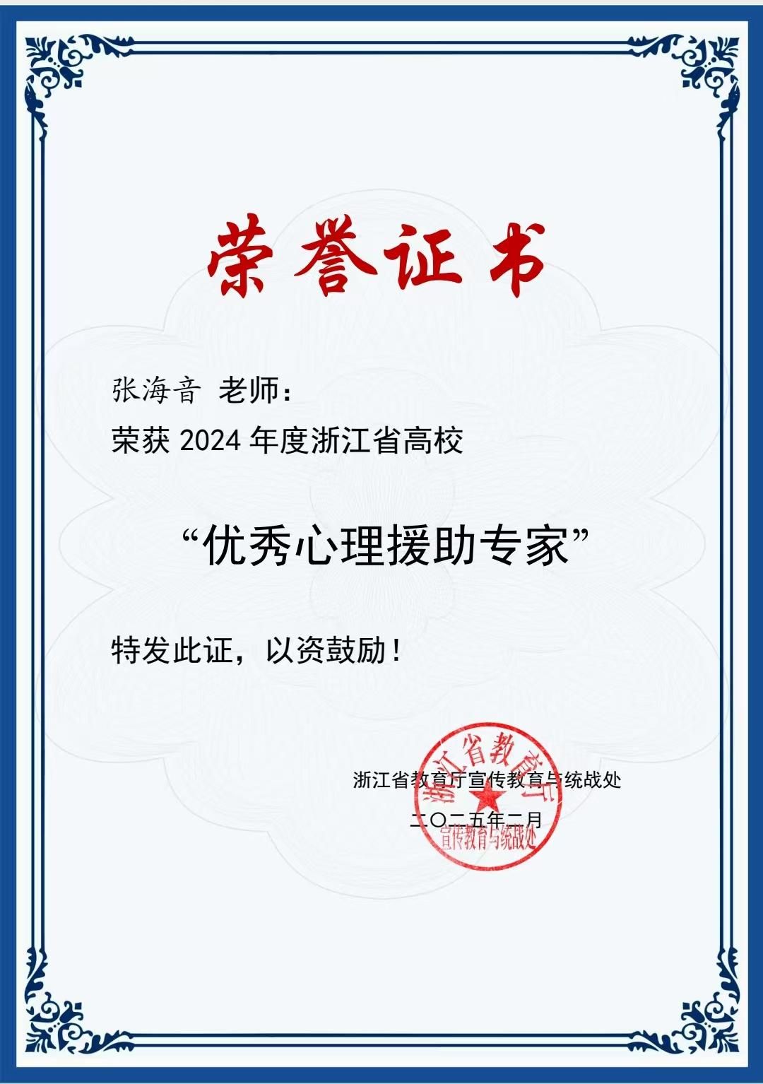 近日,2024年度浙江省高校“优秀心理援助专家”评选结果揭晓,星空平台退休教师张海音副教授从全省专家中脱颖而出,获评浙江省高校“优秀心理援助专家”。