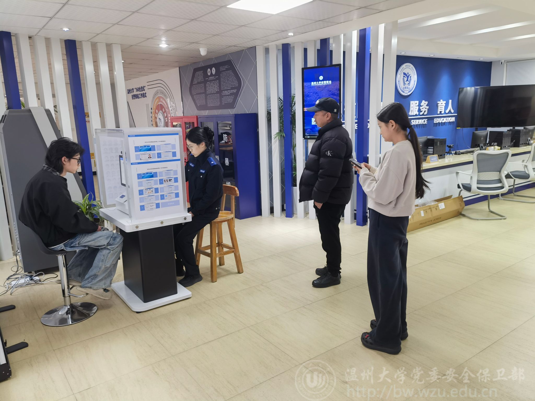 走进窗明几净的校警驿站,法学专业学生小陈正在自助终端前操作:“刷脸认证、指纹录入全程都有指引,操作非常简单便捷!”她边操作边说到,“你看这个智能拍照系统,能自动识别光线调整角度,拍出来的证件照比照相馆还要好看!”