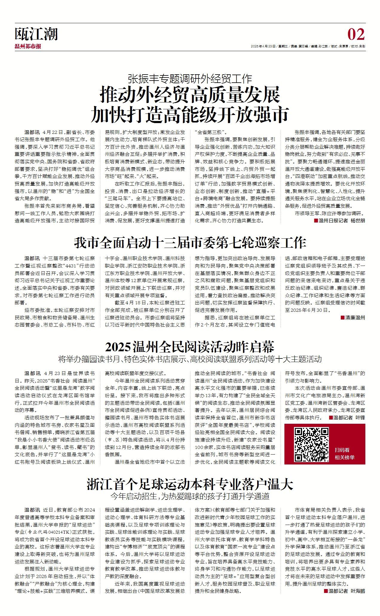 市体育局相关负责人表示,我省首个足球运动本科专业落户温州,进一步打通了热爱足球运动的孩子们的升学通道,有利于温州探索建立小学初中、高中、大学相互衔接的“一条龙升学保障体系,推动温州乃至浙江省的足球运动发展。通过专业的教育和培训,将培养出更多具有专业素养和竞技水平的高水平足球人才,这些人才将在未来的足球运动中发挥重要作用,提升温州足球的整体实力。(温都记者 叶海鹏 通讯员 高宇翔)