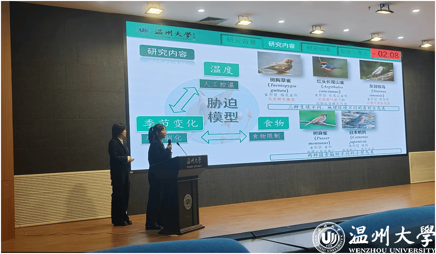 从实验室的机理探索到保护区的生命守护,团队不断创新科研方法,应对生态挑战。团队负责人徐铭茹回忆道:“高温天路边坠落的鸟,让我们意识到气候变化已逼至眼前。”不同于传统单一物种研究,他们创新性地将红头长尾山雀、日本鹌鹑等5类生态位迥异的鸟类纳入同一框架,凌晨三点记录代谢率、春节分析基因数据成为常态。首创的“三维胁迫模型”揭示了嘌呤循环在鸟类冷适应中的新机制,而“代谢表型弹性阈值”理论更为保护区规划提供了精准坐标。“这些成果正在转化为乌岩岭的保护实践。”指导老师闻靖表示。