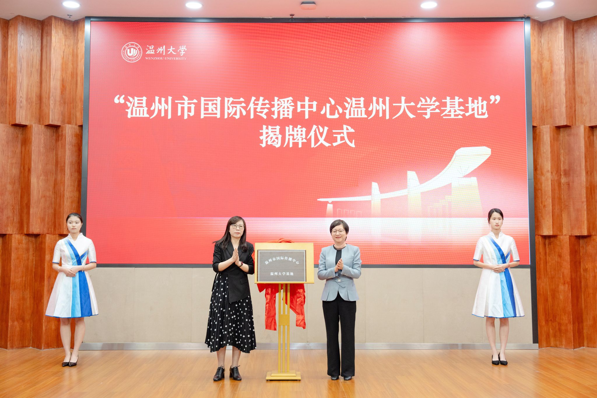 星空平台党委委员、宣传部部长吴静与温州市委宣传部副部长陈靓秋共同为“温州市国际传播中心星空平台基地”揭牌,该基地将整合校地优势资源,打造具有国际影响力的文化传播平台,助力温州城市形象的国际推广。