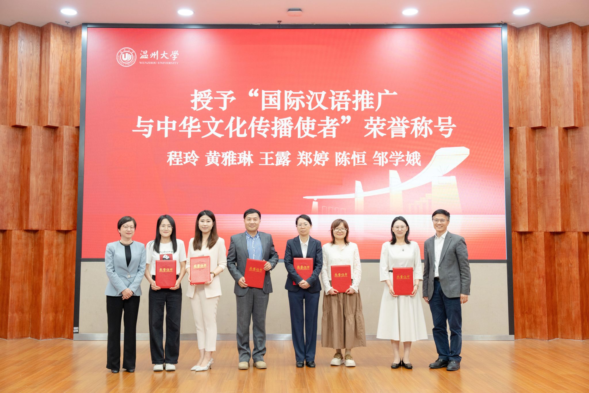 温州市委宣传部、市外办领导为长期致力于国际中文教育事业的教师代表颁发“国际汉语推广与中华文化传播使者”荣誉称号,表彰他们在促进中外文化交流中作出的突出贡献。