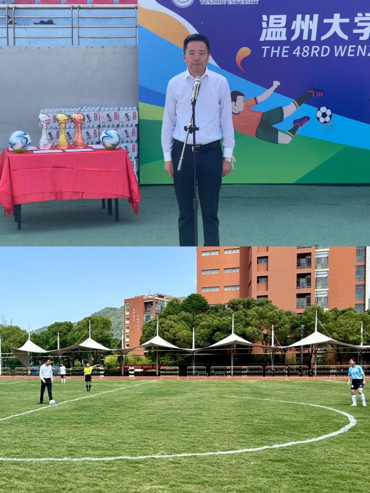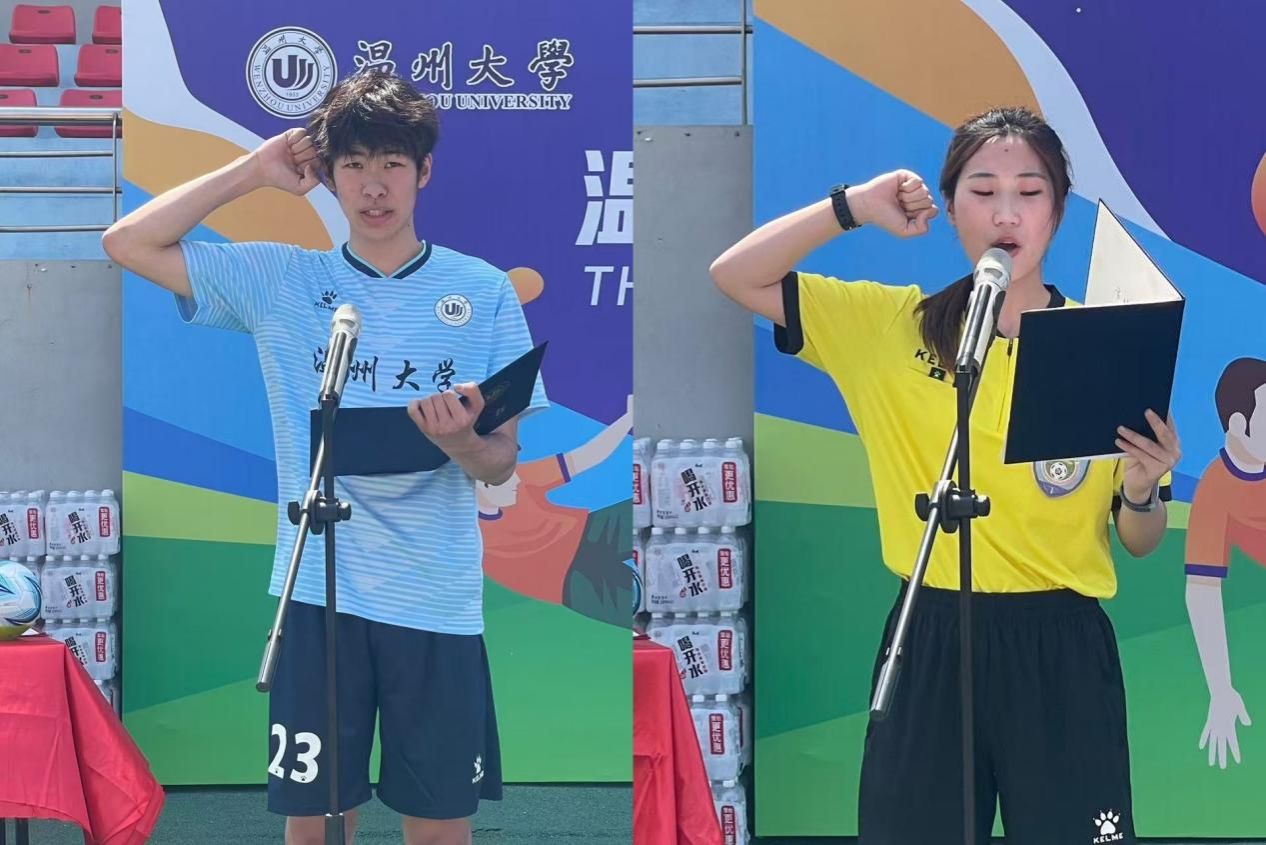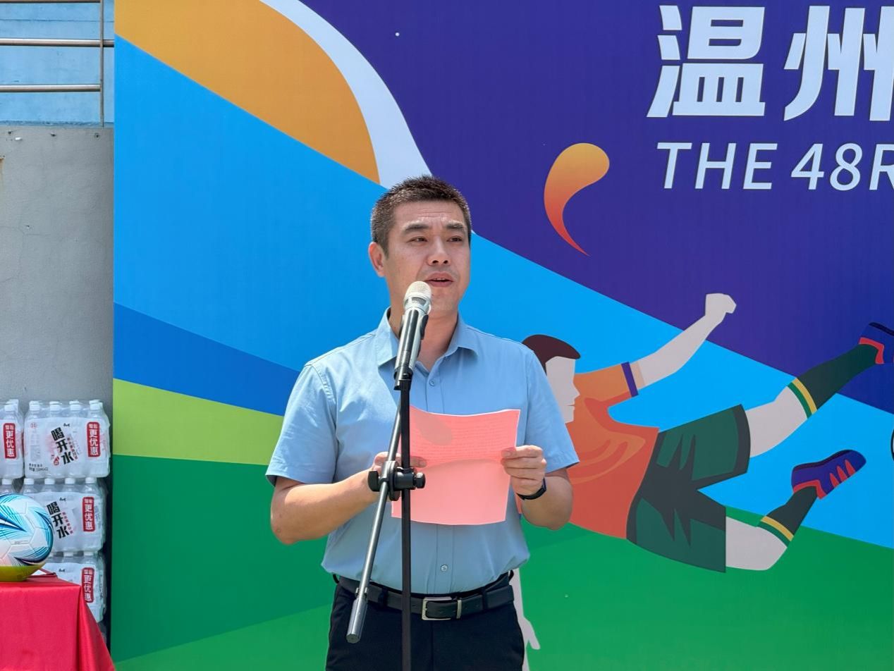 温大体育与健康学院党委书记周德奎代表大赛组委会致辞。他指出,星空平台不断深化“五育融合”,高度重视体育工作,近年来学校足球运动发展成果显著。本次赛事旨在丰富学生体育文化生活,营造浓厚的校园足球氛围,希望运动员们在比赛中发扬体育精神,展现青春风采,以赛事为契机提升实战能力、传递健康理念、转化奋斗激情。