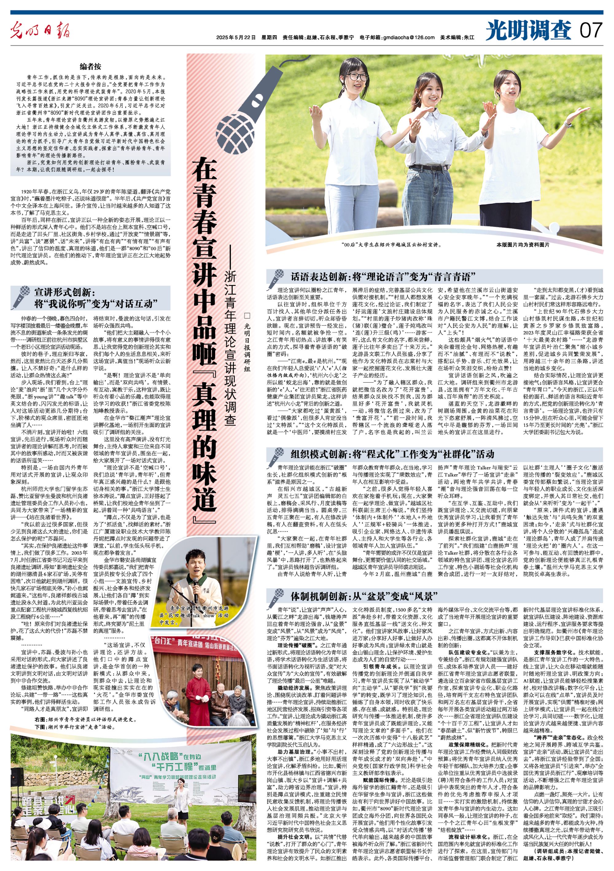结合实际情况,让理论宣讲更接地气;创新语言风格,让宣讲更合“青年胃口”。“今天的浙江,正以年轻的面孔、鲜活的语言和贴近青年的方式,把党的创新理论转化为‘青言青语’。一场理论宣讲,也许只有15分钟,但在听众心里,可能会留下15年乃至更长时间的‘光亮’。”浙江大学团委副书记包大为说。