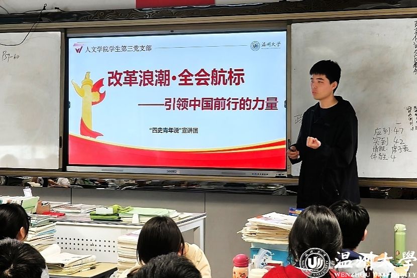 由此,一场跨越学段的思政教育接力就此拉开帷幕。刘雪婷联合陈嘉乐、吕舒晗、林倩、马文杰、徐泽宇、朱雨微等同学组成宣讲团,团结第三支部的全体成员,精心打造多个“四史青年说”宣讲主题,如“改革浪潮·全会航标”“温州故事·党纪为魂”“人民至上·全会指引”“慎终追远·缅怀先烈”等,并巧妙地将不同主题和学生日常生活中的节日内容相融合:清明节融入革命历史,缅怀先烈功绩,让学生铭记先辈奉献;世界读书日嵌入改革开放书籍阅读,引导学生从书中感受时代变迁;五四青年节植入青春奋斗主题,激励学生勇担时代使命。借助节日的仪式感和社会文化活动的感染力,让学生更加自然地接触“四史”内容,激发情感共鸣,使“四史”学习真正“接地气、冒热气”。
