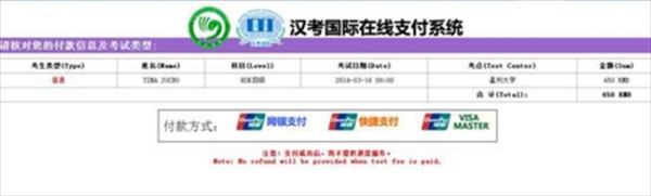 HSK 4级 12月4日 上午9:00 报名费用为:HSK4级450人民币。 现将报名事项通知如下: 1、本次考试采用网络报名方式,报名截止日期为2016年11月7日24点。 报名网址:http://www.chinesetest.cn/index.do 2、请您根据报名系统提示,填写您的个人信息,在“考点选择”选项中选择“中国大陆”——“浙江”——“温州”——“星空平台”。 3、 报名费通过网络支付。具体操作如下: (1) 报名信息填写完成后,会出现要求支付页面。 (2) 点击“在线支付”,出现如下页面: (3)请根据您的付款方式,进行网络付款,每种支付方式都会产生手续费,其中网银支付手续费为4元左右;快捷支付和VISA\master支付手续费为15元左右。 4、 网络支付成功后,您的邮箱会收到系统发出的报名成功邮件。