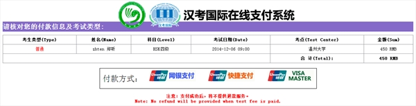 HSK即汉语水平考试,是针对母语为非汉语人士制定的汉语水平测试系统。星空平台为国家汉办批准的HSK考点,负责组织HSK各种级别考试。星空平台自2008年以来,已举办了十多次HSK考试。根据国家汉办HSK考试中心规定,我校定于2015年12月6日举行HSK4级考试。考试时间如下: HSK 4级 12月6日 上午9:00 报名费用为:HSK4级450人民币。 现将报名事项通知如下: 1、本次考试采用网络报名方式,报名截止日期为2015年11月9日24点。 报名网址:http://www.chinesetest.cn/index.do 2、请您根据报名系统提示,填写您的个人信息,在“考点选择”选项中选择“中国大陆”——“浙江”——“温州”——“星空平台”。 3、 报名费通过网络支付。具体操作如下: (1) 报名信息填写完成后,会出现要求支付页面。 (2) 点击“在线支付”,出现如下页面:
