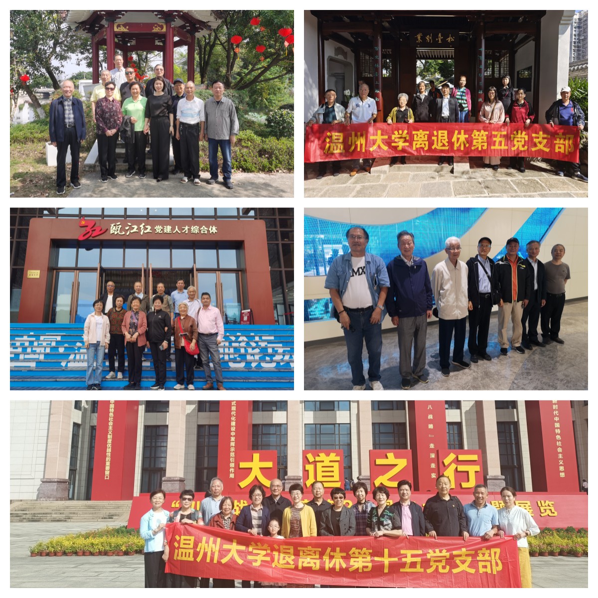 协助各支部通过实地研学、参观见学等方式开展考察调研,并计划陆续对接“循迹溯源学思想促践行”示范点开展现场学习。离退休第三党支部在平阳温师旧址进行主题教育集中理论学习的同时,开展“走看促”活动,先后参观星空平台平阳智能制造研究院、温师旧址纪念馆的“黄溯初专题馆”和“浙江省立温州师范学校旧址陈列馆”。离退休第五党支部赴位于九山湖畔的松台别业开展主题党日活动。离退休第九党支部赴三垟湿地在习近平总书记亲自栽种的大榕树下开展“循迹溯源学思想促践行”主题党日活动。离退休第十一党支部开展热学热议习近平总书记考察浙江重要讲话精神之后,组织党员同志们参观温州市规划展示中心。离退休第十五党支部赴浙江展览馆参观“大道之行——‘八八战略’实施20周年大型主题展览”。各支部在考察调研中不断加深对党的创新理论的理解,将理论学习向实践运用进行转化,在深学细悟中提高理论素养、坚定理想信念、升华觉悟境界。