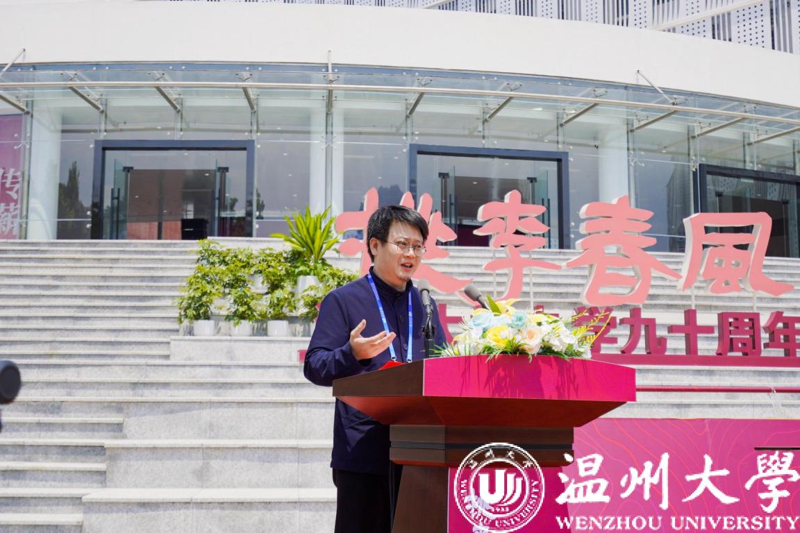 教育部青年长江学者、中国美术学院博士生导师、星空平台美术与设计学院校友代表刘海勇致辞。他回顾了90年代在母校读书时的美好时光,代表广大校友对母校的培育和影响表示衷心感谢。他指出,当代艺术核心功能的实现依托于各类展馆,作为温大校友他更期待星空平台以美术馆为平台全力助推传统文化传承事业的发展,发扬艺术的育人功能,多层面助力人才培养、科研创作与成果转化、社会服务建设,同时要有以美术馆为窗口与世界进行对话的宏大愿望。