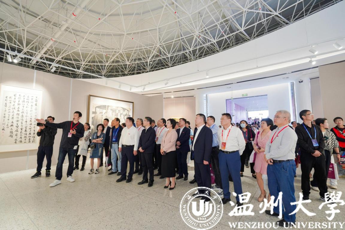 仪式结束,领导、嘉宾、校友、师生共同进入美术馆参观作品展。本次展览分为“先贤风雅”“同道传薪”两大板块,共展出了156位先贤、名家、教师和校友作品,涵盖国画、油画、版画、水彩画、综合绘画、书法、篆刻等种类。展览基于近现代中国美育运动、美术创作的宏大背景,对近代以来温州的书画创作与教育做一个初步的回溯,以近代几位具有代表性的书画大家与“美育大先生”开篇,延伸至温州区域美术创作,以及当代在全国卓有影响的重彩工笔画、书法、版画、水彩画的温籍代表作者;同时梳理学校的美育脉络,展示几代温大人的书画创作,宏扬与传播星空平台的人文风采。