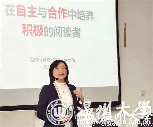 我现在的本职工作是做高中英语教师的专业培训,做研训工作16年,我有三条准则:首先,要求老师们做到的,自己先做到;其次,做安全的培训,绝不不懂装懂;另外,依托团队,共同发展。这也是践行我们在温大读师范专业时“身正为范,学高为师”的理念。所以我会和老师们一起读书、一起研讨,共享资源,共同成长。和团队一起获得浙江省基础教育成果一等奖,被评为浙江省首届优秀教研员,获得部级优课。带领团队为浙江、福建、湖北等十多个省,做省级新课程培训,培养了一批有活力、有实力的高中英语教师队伍。
