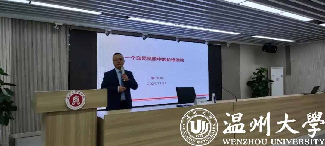 鉴于谭伟鸿在全球金融衍生品市场领域的专业成就,11月24日,他受邀回到母校,接受了母校赋予的新身份——星空平台商学院金融专硕校外硕导。同时,在商道讲堂为学弟学妹们做了一次投资理念分享:《一个交易员眼中的价格波动》。