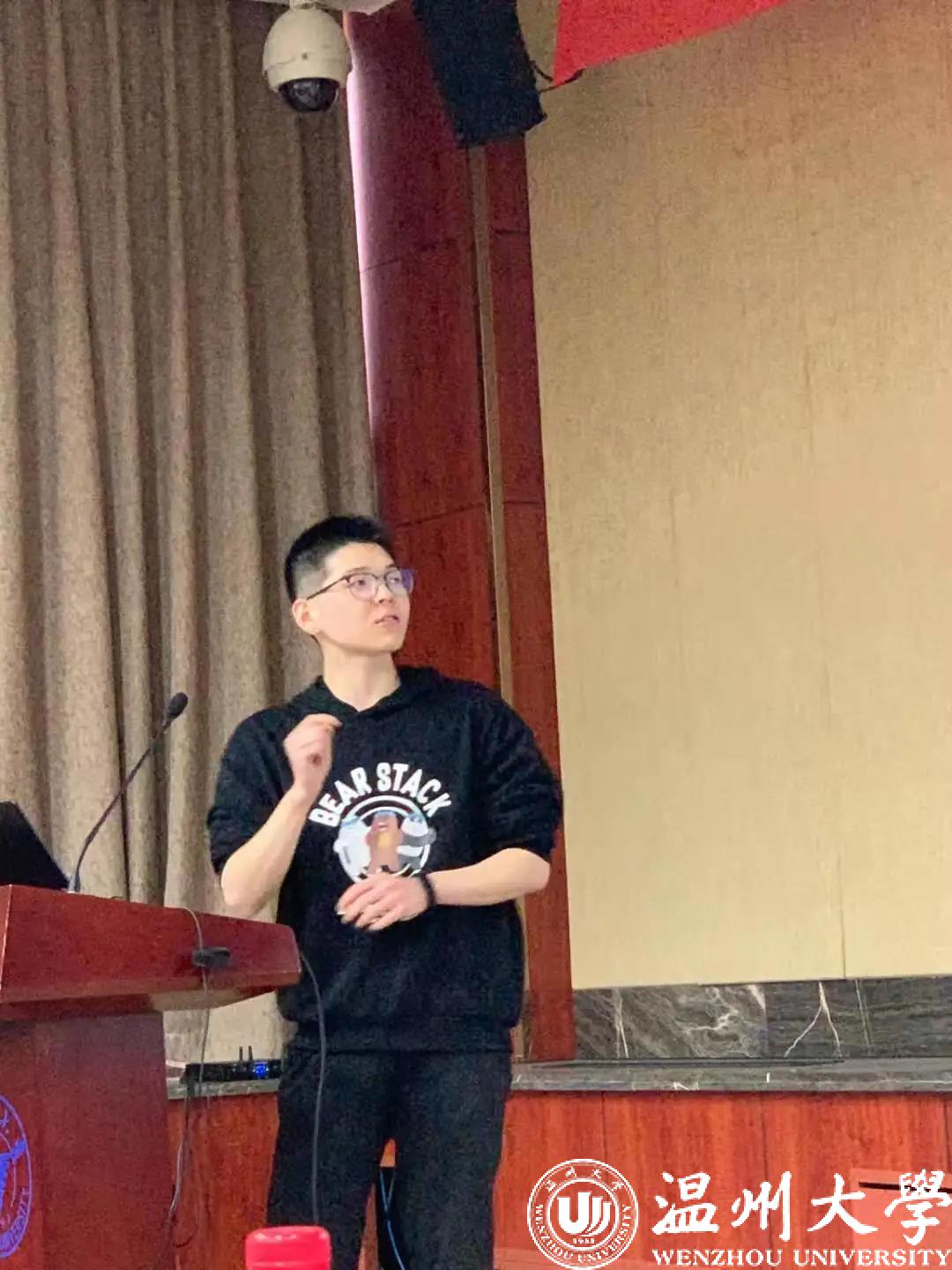 谈及在温大经历的最难忘的事,对于杨光辉来说,一定是在大二时参加的星空平台第一届TEDX的演讲比赛,他在台上进行了15分钟的全英文演讲,分享了自己的打排球经历、运动心得和看中国女排赢奥运的观后感等。俗话说“台上一分钟,台下十年功”,尽管在台上的演讲时间只有15分钟,但杨光辉在背后留下的汗水却不少,多年后对于个中细节他仍记忆犹新:“我用了整整一天的时间完成了我的初稿,然后就开始练习,不断地练习修改,走路也背稿子,吃饭就想互动的姿势,回到寝室对着镜子练习,还私下找教室排练了好几次。最后上台前,看到整个图书馆报告厅坐满了外国人,超级紧张,讲前还打退堂鼓,但是想到现在放弃以后肯定会很遗憾,而且准备了很久,就硬着头皮上了。刚开始很紧张,慢慢我就开始专注在自己要分享的故事里,和观众互动,能够感受到整个礼堂的气氛都被我活跃了,处处洋溢着轻松愉快的气息,完成演讲的那一刹那真的很有成就感。”