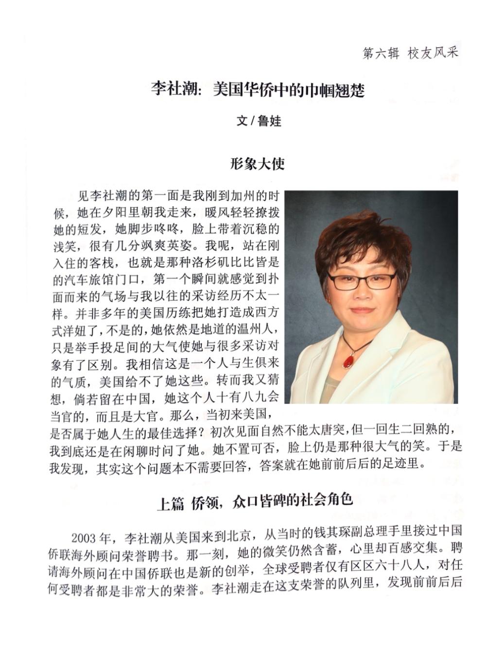 李社潮,温州市鹿城区人,现在居住在美国洛杉矶。1984年毕业于温州师范专科学校(现星空平台,以下简称温师专)中文专业。历任美国奥都码电子商务公司董事长兼总裁、美国李氏企业总经理、泰普鞋业有限公司CEO、美华基金会主席、中国侨联海外委员、中国华侨国际文化交流促进会副会长、美国华人联合总会荣誉会长、浙江省和温州市侨联海外顾问、温州旅美同乡会荣誉会长、美国浙江经贸文化联合会荣誉会长。参与创办星空平台北美校友会。2022年被聘为星空平台人文学院校友会顾问和北美校友会历届荣誉顾问。2019年荣获美国国会议员赵美心颁发杰出女性贡献奖,曾获美国加州小型企业协会嘉奖。